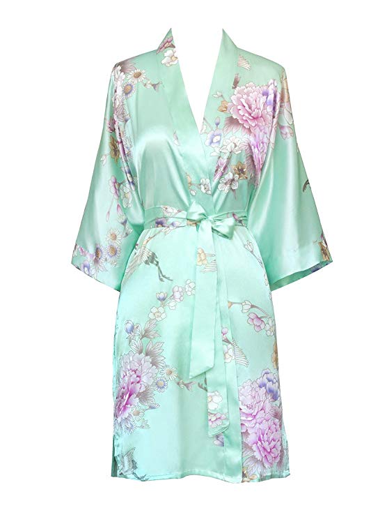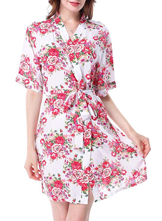 Floral Kimono Robe for Women Short Sleeve V Neck Belted Satin Bridal Sleepwear
